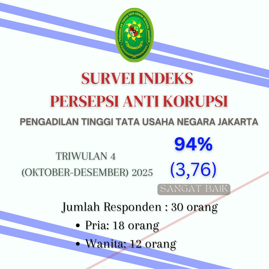 Berikut adalah survei Indeks Persepsi Anti Korupsi pada Pengadilan Tinggi Tata Usaha Negara Jakarta dengan jumlah responden 30 orang
